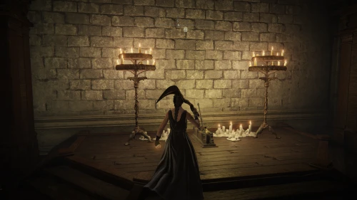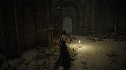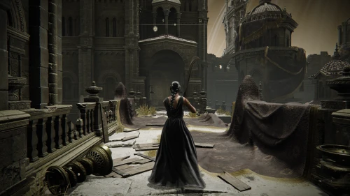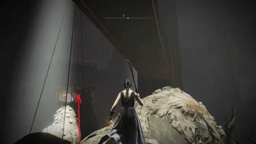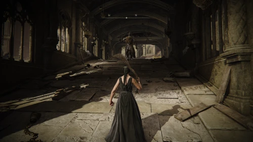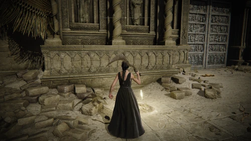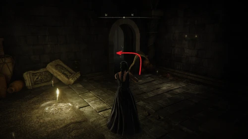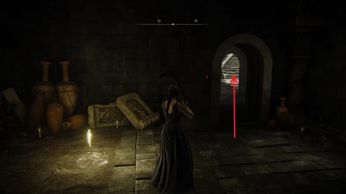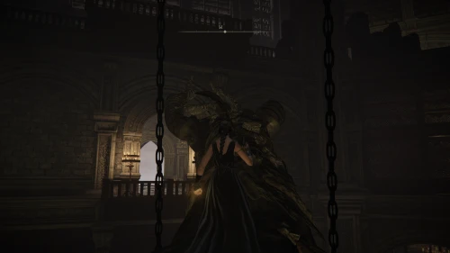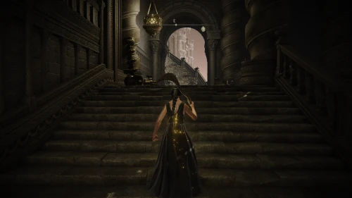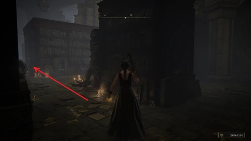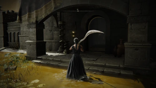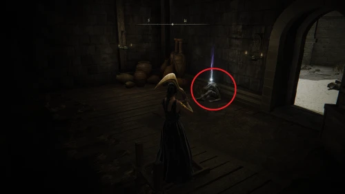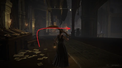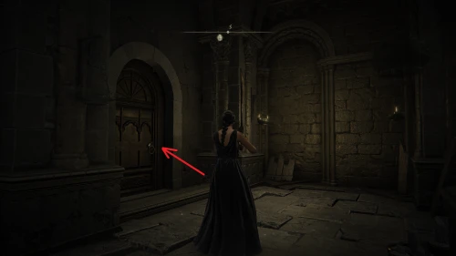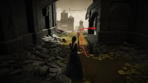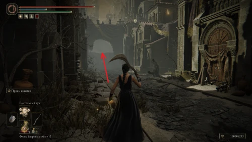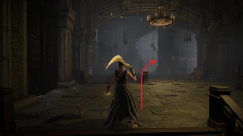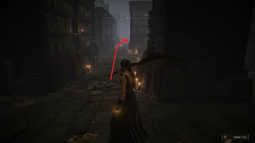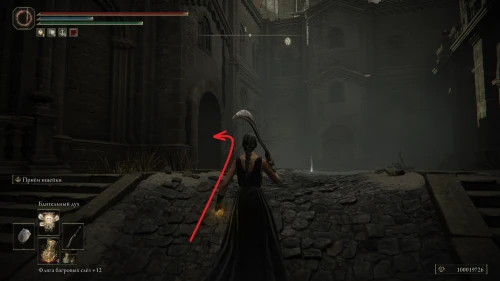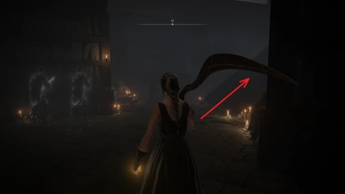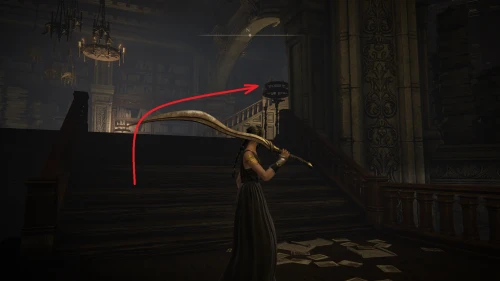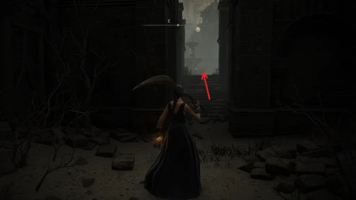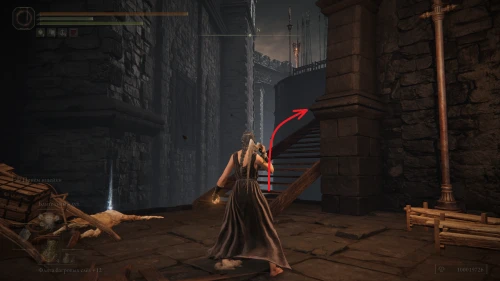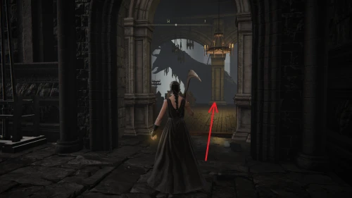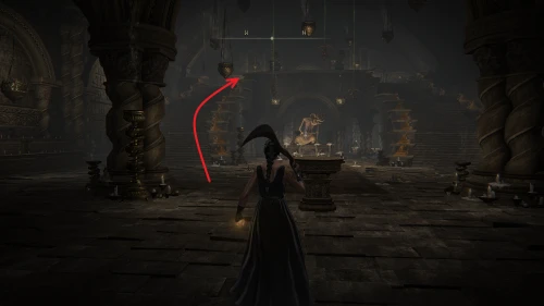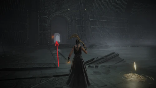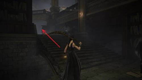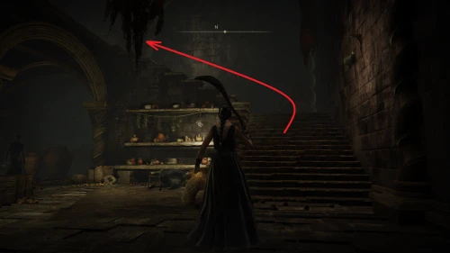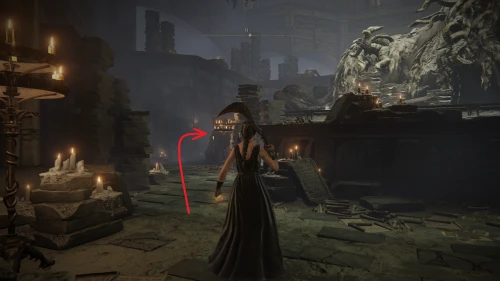 Чтобы найти ключ от нее, от той же благодати следуйте уже прямо в северо-западный выход. Поднимитесь вверх по лестнице и, не доходя до обрыва, поверните направо. Следуйте по проулку, кишащему тенями, и дойдите до верха небольшого водопада.