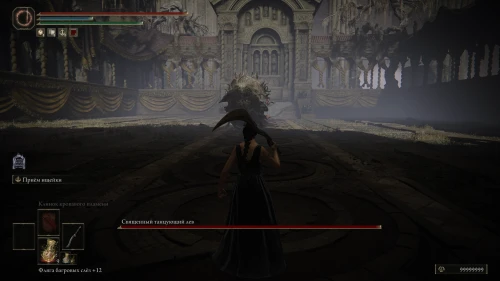 Идите на запад и поднимитесь по лестнице на самый верх, чтобы дойти до благодати «Передняя сторона сцены». Перед тем как выйти на арену, найдите знак призыва Рыцаря рыжей гривы Фрейи и вызовите ее к себе в помощники.