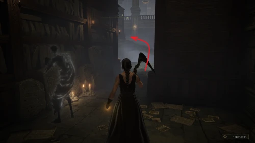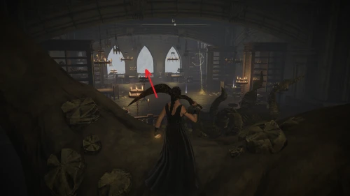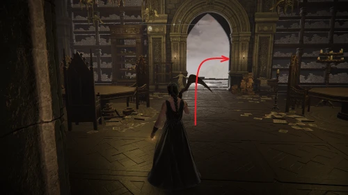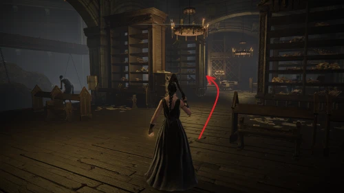 Идите прямо за первое чучело и отыщите лестницу наверх. Следуйте между книжных полок и поднимитесь по следующей лестнице, которая находится на северной стороне.