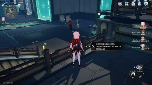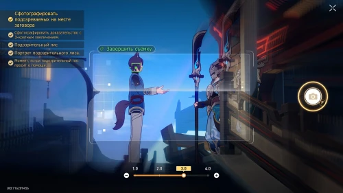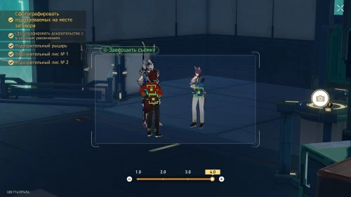 Завершив беседу, спуститесь по ступенькам ниже и подойдите к светящейся искорке на перилах. Затем выберите опцию съемки подозрительных личностей, нажав клавишу «F». Прежде чем сделать снимок, наведите камеру на подозреваемых и увеличьте зум 2 раза, чтобы достичь показателя «4.0».