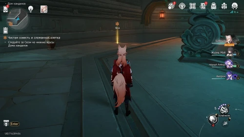 После разговора с судьей взаимодействуйте с ширмой телепортации для перехода в другую область. Перед этим можете еще раз поболтать с Ханьей, стоящей неподалеку. Переместившись на противоположную сторону, начните спускаться вниз по лестнице, а потом войдите в лифт, на который указывает маркер.
