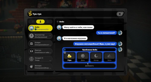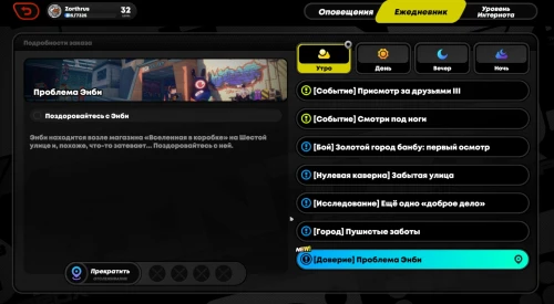 Данная механика понадобится вам для повышения доверия со своими агентами. Отправьте сообщение Энби, следуя инструкциям на экране. Во время беседы с ней можете выбирать любые ответы, так как они ни на что не повлияют. Вы узнаете, что девушка сейчас находится возле магазина игрушек. В ваш ежедневник добавится заказ «Проблема Энби», который можно выполнить только Утром.