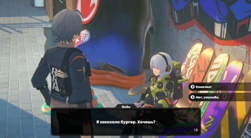 Итак, дождитесь наступления утра, а затем направляйтесь в сторону Магазина игрушек (там, где продают амплификаторы). По дороге туда на скамейке из скейтбордов вы обнаружите Энби. Подойдите к ней и вступите в диалог с девушкой. Сразу отметим, что ваши ответы с большой вероятностью не влияют на концовку и вашу награду (уровень доверия с Энби вырастет в любом случае), однако на всякий случай мы укажем свои варианты ответов.