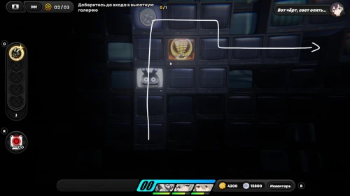 Возвратитесь в обычный режим, подберите денни справа, а потом начните двигаться наверх к лампочке. Затем сверните вправо и дойдите до основного коридора. Пока что не поднимайтесь верх – вместо этого снова активируйте инфракрасный обзор и пройдите направо к синему банбу, дабы он открыл вам проход. Вернитесь в обычное состояние и идите в правый закоулок для получения фиолетового чемоданчика.