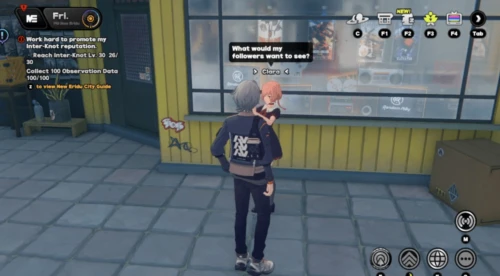 Разобравшись с указанными требованиями, начните внимательно осматривать область перед своим видеопрокатом. В один день вы должны будете заметить напротив него девушку с розовыми волосами по имени Клара – поболтайте с ней и выполните ее просьбу. Затем обновите локацию или дождитесь следующего дня, пока блогерша не появится прямо рядом с входом в ваш магазин. Поболтайте с ней и согласитесь помочь.