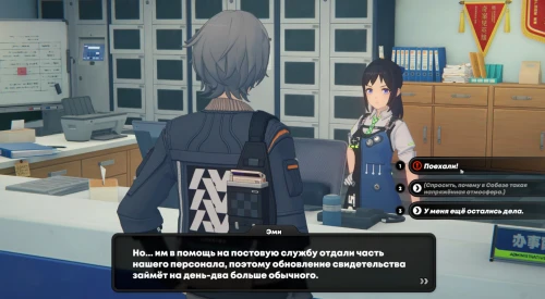 После этого тут же начнется нужное вам задание. Плюс, будет разблокирована новая локация – Служба общественной безопасности Нью-Эриду. Переместитесь в указанную область и подойдите к стойке регистрации. Поговорите с Эми – можете выбирать любые ответы, так как они не повлияют на концовку и награды. Затем скажите «Поехали»
