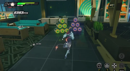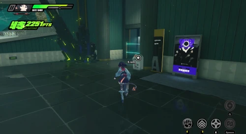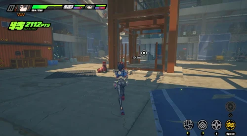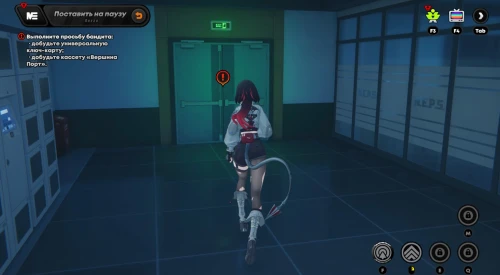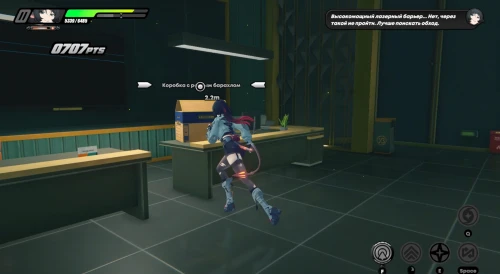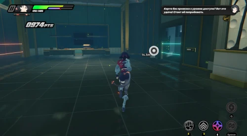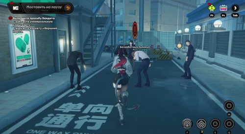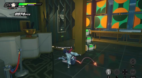 В основном придется драться с рядовыми бандитами и разыскиваемыми громилами. Карты доступа же будут подсвечены маркерами. Не забывайте крушить зеленые и фиолетовые канистры для восстановления здоровья и энергии. Расправившись со всеми врагами, поднимите баффы слева, а потом поднимитесь по лесенке вверх.