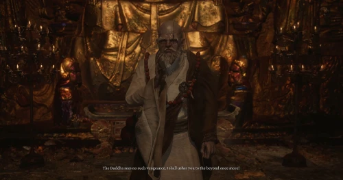 Зайдите в него, воспользуйтесь лестницей справа и, добравшись до второго этажа, выйдите наружу. Поверните направо и выйдите через открытые ворота. Поднимитесь по каменной лестнице на самый верх и войдите в храм, где перед золотой статуей Будды будет находиться Монах Неопустевший.