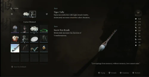 После разговора с ней, в инвентаре у вас появится легендарный предмет Кисть из песца, с помощью которой вы сможете принимать вид снежной лисы, вплоть до окончания ее квеста. Превращение в снежную лису сделает вашего персонажа чуть быстрее и поможет привлекать меньше внимания. Принимать форму лисы или же оставаться в обычной — не имеет значения. Кисть пригодится вам только в конце вашего пути.