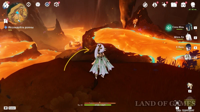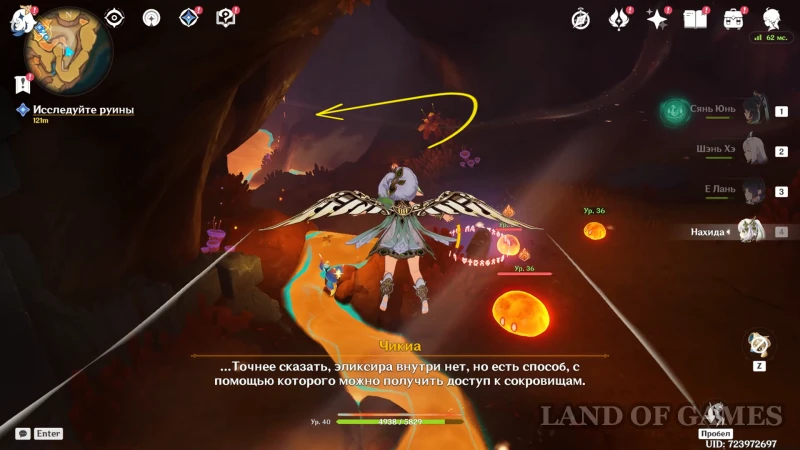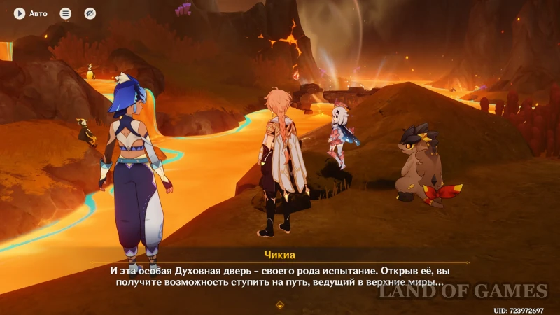 После спуститесь к глиняному кольцу в озере по центру лавовых руин и узнайте от Чикиа условия следующего испытания.
