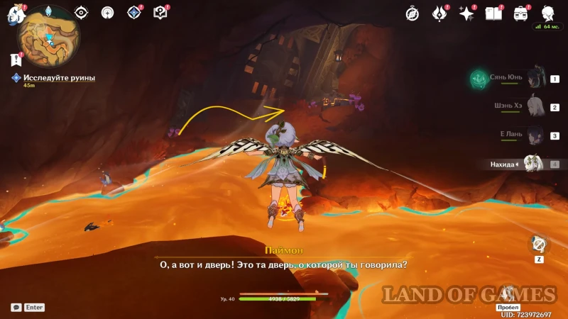Через открывшийся проход двигайтесь до конца коридора и спрыгните на планере в дыру. Далее следуйте по течению лавовой реки в пещеру с горящим озером, в северной части которой находятся уже вторые запертые врата — к ним нужно подойти.