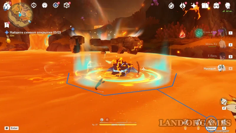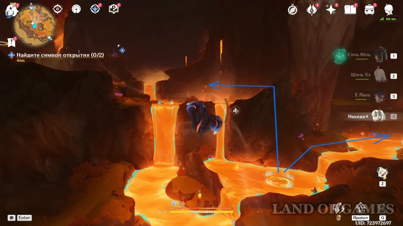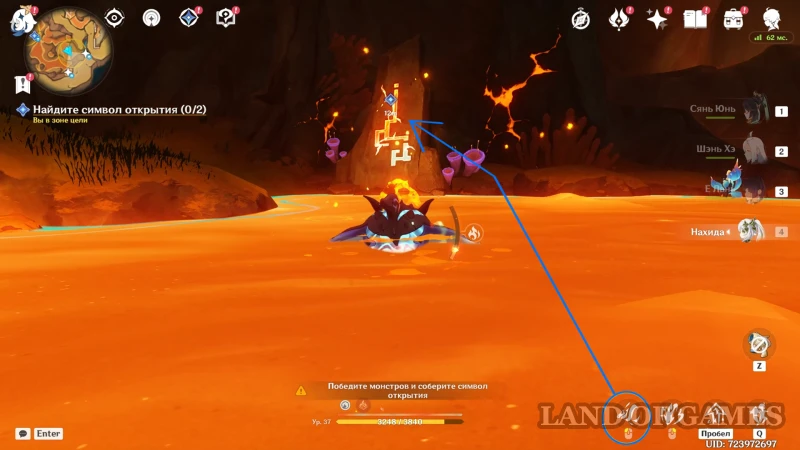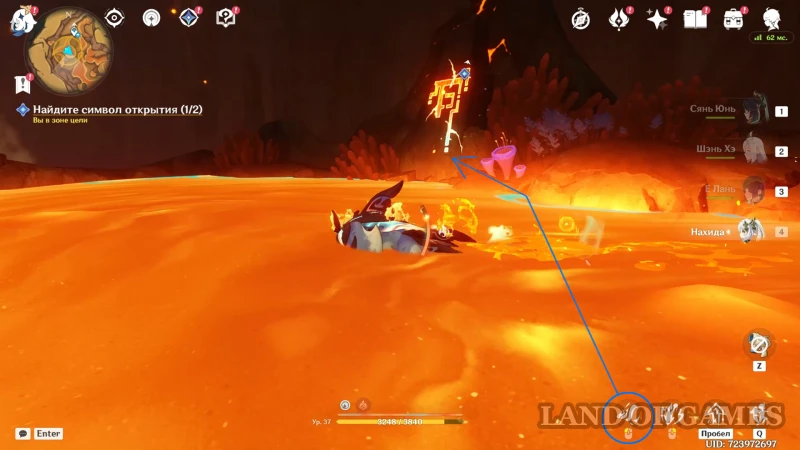 Вторая пика с символом открытия находится в огненном источнике под телепортом: доберитесь до места, где ранее закрыли первый Радужный луч, используйте воздушное кольцо в лаве, поднимитесь по нему до второго вооружения и закройте луч с близкой дистанции. Затем подплывите к последнему символу и сделайте по нему рывок.