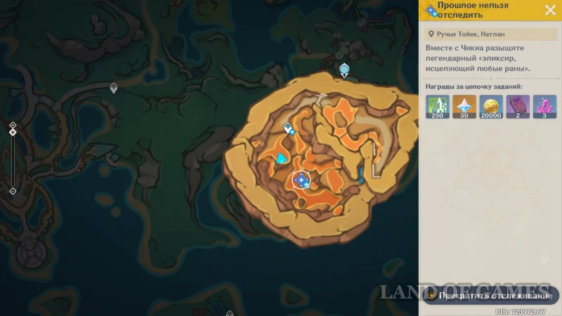 В Genshin Impact «Прошлое нельзя отследить» является мировым квестом Натлана и первым этапом цепочки поручений «Повесть о мечтах, вырванных из огня». По сюжету миссии, мы пробираемся в руины под Водами Амейялько и знакомимся со страдающей от боли в спине Чикиа. Нам нужно помочь уроженке Повелителей Ночного Ветра исследовать лавовые руины, открыть духовный путь в верхние миры и заполучить «эликсир, исцеляющий любые раны