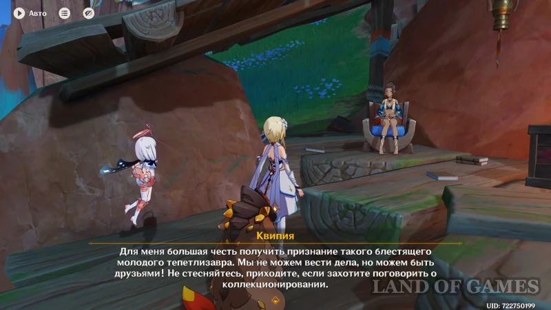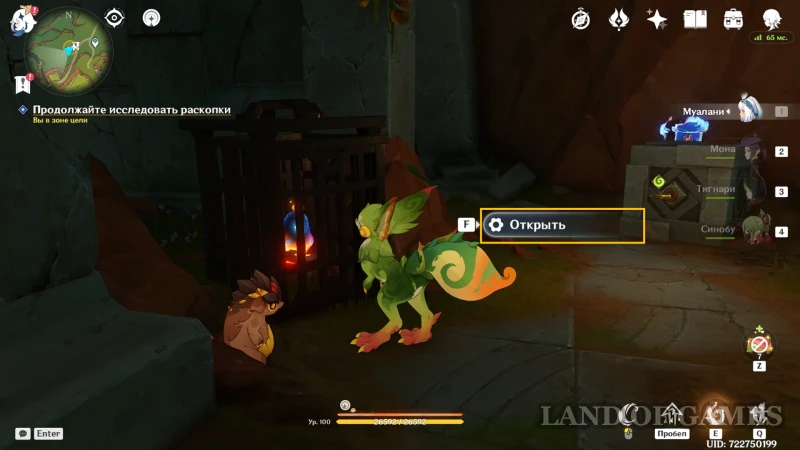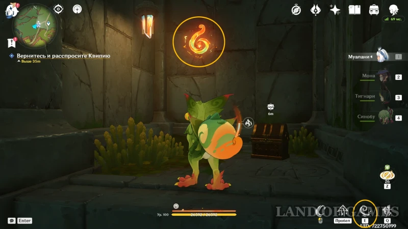 В форме дендро дракона поднимитесь на ярус с драгоценным сундуком, залутайте награду (+ 10 примогемов, 30 опыта приключений, 3 Пиро печати и немного рандомной экипировки) и вернитесь к Квипие.