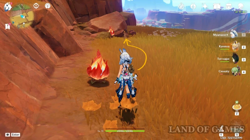 Бегите за спутником и подождите, пока он окончательно не остановится около пылающего бутона. Зверек указывает на растение, которое явно должно помочь в лечении кукузавра.