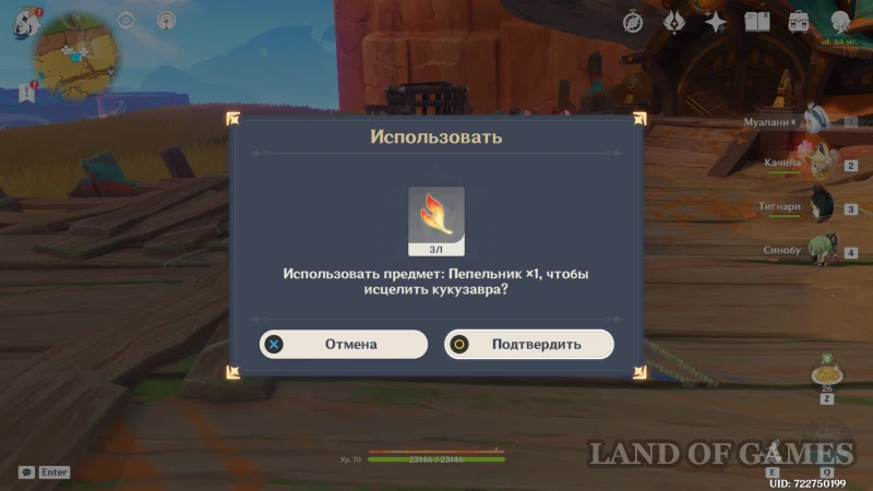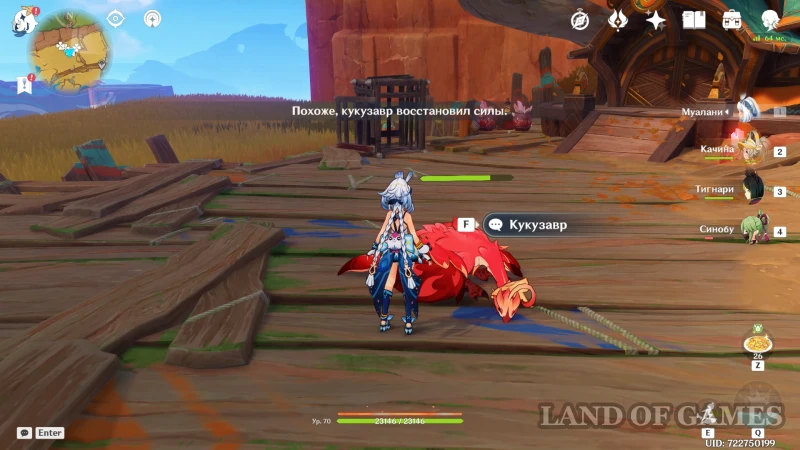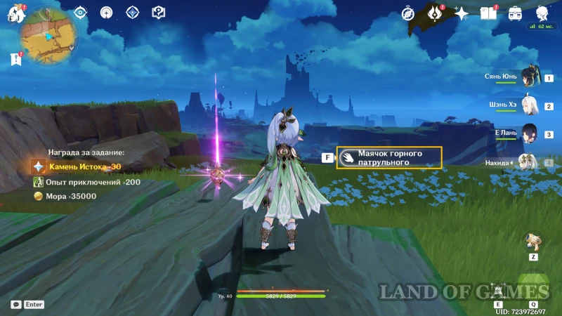 Исцеленный кукузавр оживится и спокойно уйдет к краю лагеря, а затем вовсе улетит вдаль. Гордый пернатый дракон не будет выглядеть благодарным, однако оставит после себя небольшой подарок. После квеста мы получим 30 примогемов, 200 баллов опыта приключений и 35 тысяч моры. Обязательно подойдите к месту, от которого улетел дракон, и заберите оставленный эпический артефакт — Маячок горного патрульного.