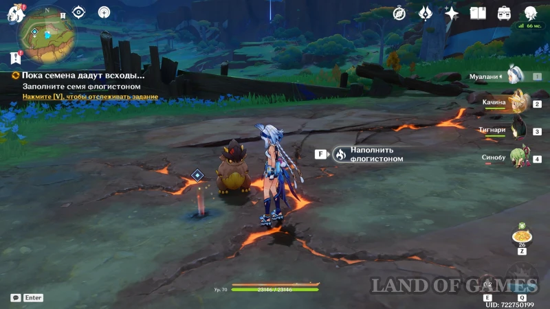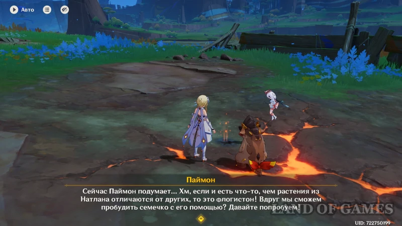 После обнаружения семечка, дракончик сам сделает для него лунку — нам нужно лишь немного подождать. Затем компания решит пробудить его особой энергией Натлана, поэтому после высадки нужно наполнить его флогистоном.