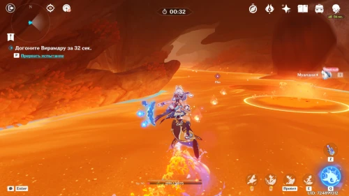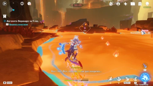 Идите дальше, перелетите через водопад жидкого флогистона и поговорите с учеными. Вирамдра увидит золотое свечение — это вулканит, редкая и дорогая руда. На карте Муалани, однако, написано, что нужно идти в противоположную сторону от золотого света. Вирамдра решит, что девушка хочет присвоить сокровища себе, и убежит. Лава тут же начнет подниматься.