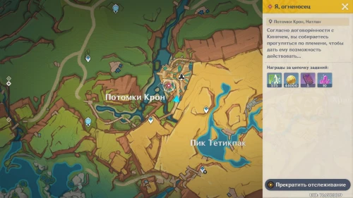 Далее переместитесь в поселение Потомков Крон, расположенное практически в центре Натлана, и прокрутите время с помощью меню Паймон на следующий день (08:00-12:00). Потом пройдите на нижнюю площадку и поболтайте с Хуни и Тобой.
