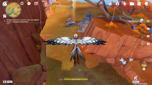 Телепортируйтесь к путевой точке рядом с поселением Потомков Крон, а затем развернитесь и спуститесь вниз к квестовому маркеру. Вы обнаружите воришку. Потом начните погоню за ним. Советуем вам трансформироваться в юмказавра с помощью зеленого камня превращения (клавиша «Т») и начать двигаться вслед за преступником, прикрепляясь к печатям наверху (клавиша «Е»). На гифке ниже продемонстрирован соответствующий процесс.