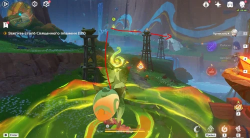После перемещения в новую локацию поболтайте с Киничем. Он объяснит вам правила проведения церемонии. Вам необходимо будет зажечь несколько столбов в определенной последовательности. Правильный порядок продемонстрирован на карте. Далее мы в деталях расскажем вам, как пройти данное испытание.