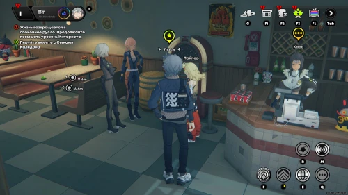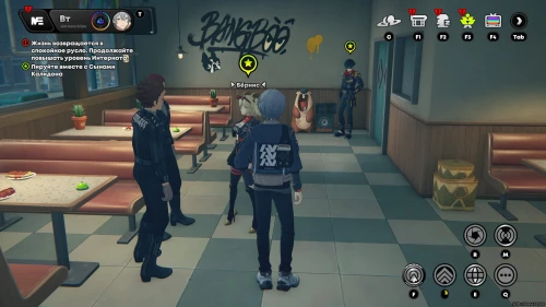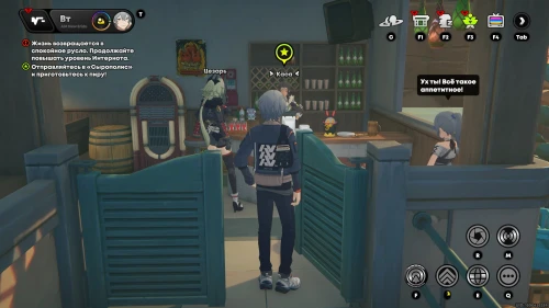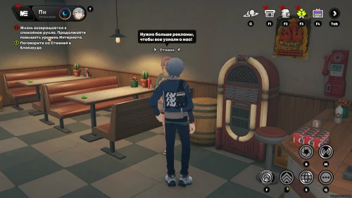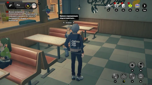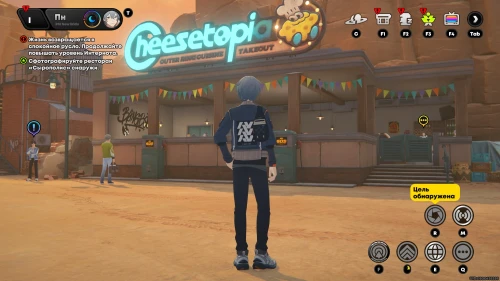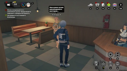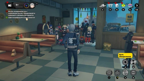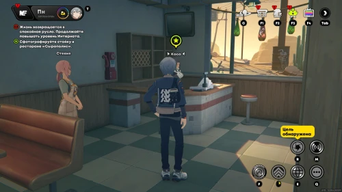 Пообщайтесь с розоволосой девушкой по имени Стевия, ждущей вас внутри ресторана. Она попросит вас сделать фотографии ресторана. Для этого нажмите клавишу «R», а потом наведите объектив на интерьер заведения и сделайте фото (главное, чтобы справа горела надпись «Цель обнаружена»).