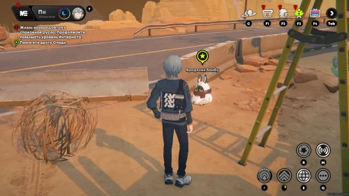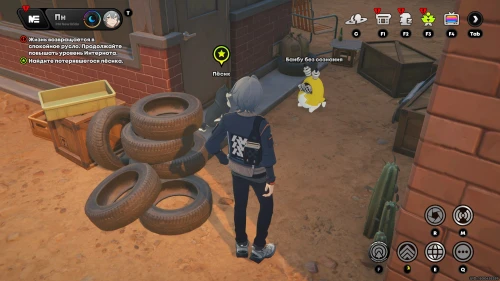 Отыщите Беззаботного парня слева от ресторана и пообщайтесь с ним. Он расскажет вам о пропавшей собаке. Развернитесь и отыщите Песика за покрышками. Он будет сидеть рядом с банбу без сознания. Далее взаимодействуйте с кроликом для его починки.