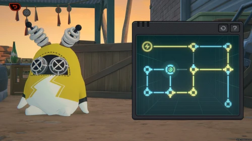 Вам предстоит разгадать очередную загадку с цепями и затворами. Сначала поверните узлы так, как показано на первом скриншоте ниже, чтобы заполнить синие ячейки питания. Далее сверните их так, как продемонстрировано на втором изображении, чтобы закончить решение головоломки. После ремонта банбу задание подойдет к концу.