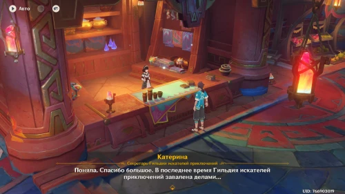 Сначала подождите два игровых дня с помощью меню Паймон. Далее переместитесь к телепорту в Стадионе священного пламени и направляйтесь к гильдии искателей приключения, чтобы поговорить с Катериной и Качиной.