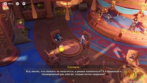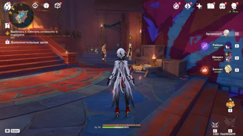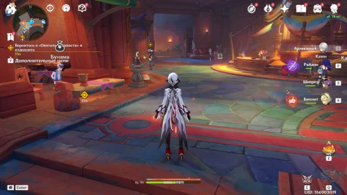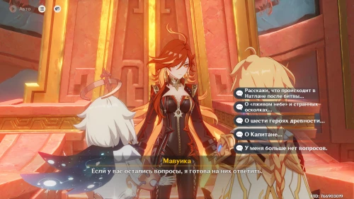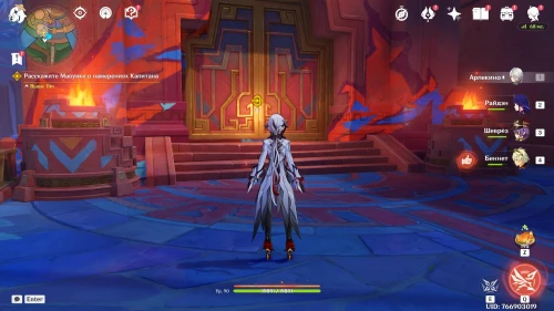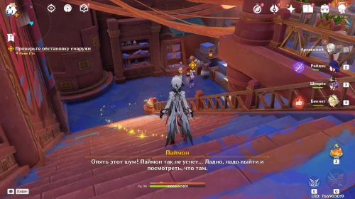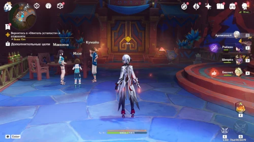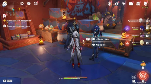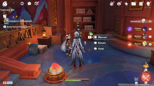 Кинича и Иансан можно отыскать рядом с выходом из гостиницы. Здесь также будет Ахав. Оророн и Капитан стоят позади заврианов. Предвестник Фатуи отметит, что мы очень похожи на Царицу, правительницу Снежной. Затем можете пообщаться с Пиро Архонтом, стоящей возле барной стойки. Можете выбирать любые ответы, так как они лишь немного повлияют на диалог.