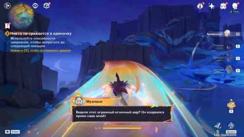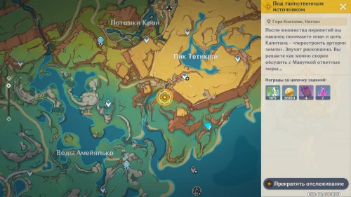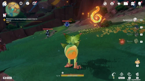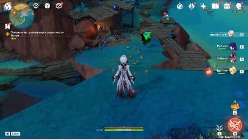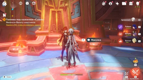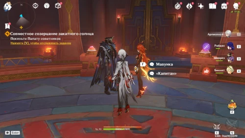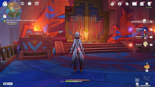 Переместитесь к южному телепорту Стадиона Священного пламени и войдите в Палату советников, чтобы пообщаться с Мавуикой. После кат-сцены переместитесь к телепорту прямо возле нового квестового маркера к востоку от Вод Амейялько. Кинич разберется с основными силами Фатуи, а вам предстоит расправиться с патрульными.