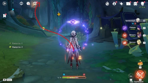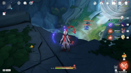 Пройдите вперед по туннелю и разберитесь с двумя Гео слаймами для разблокировки обычного сундука. Поднимитесь и пройдите через отверстие, чтобы попасть в просторную область. Вы можете сразу последовать за маркером или сначала спрыгнуть вниз и расправиться с Фатуи, дабы подобрать различные материалы в ящиках.