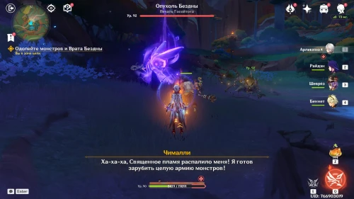 Появившись в новой области, бегите вперед и вступите в бой с монстрами Бездны. Вам необходимо будет уничтожить 3 врата Бездны, расположенные вокруг опухоли. При этом вам будет помогать Мавуика, кидая огненные шары с неба и иногда подлечивая ваших персонажей. Все это заметно упростит битву.
