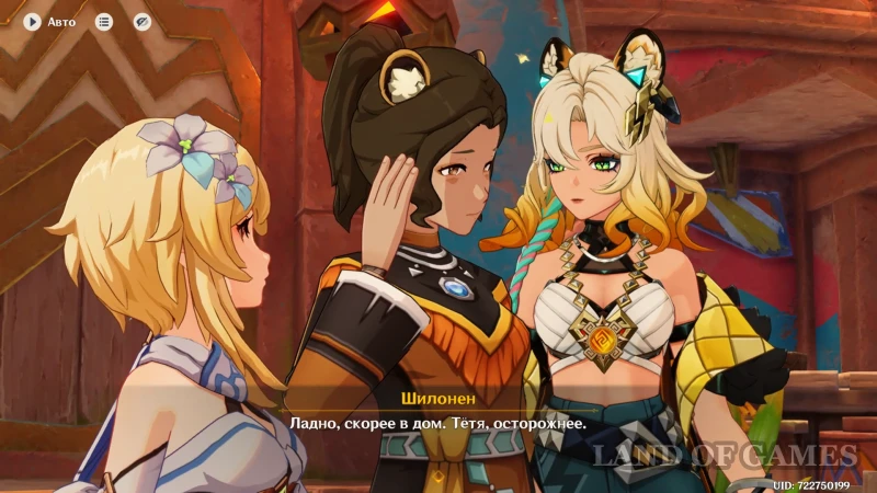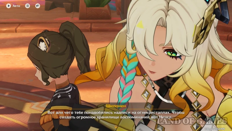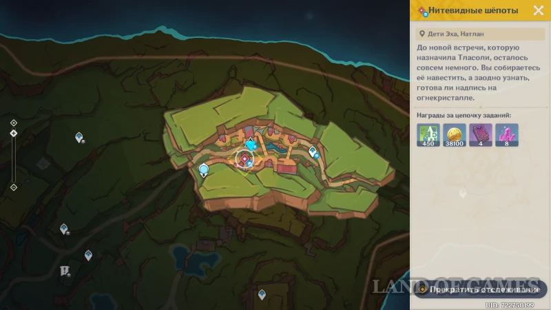 В Genshin Impact «Нитевидные шепоты» является вступительной частью квеста «Мелодичное пение» — последней главы Хроник племени Детей Эха и заданием легенд Шилонен. Совсем скоро в семье Тласоли состоится радостное событие — день рождения маленькой Нечки. Но перед этим нужно навестить Шилонен и поинтересоваться, что она подготовила для любимой дочки бывшего кузнеца древних имен. Компании нужно навестить Тласоли, отдать подарки и помочь с доставкой продуктов.