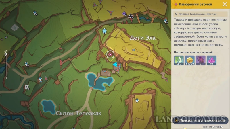 В Genshin Impact «Какофония стонов» является прямым продолжением миссии «Слабые сигналы» и предпоследним этапом крупной линейки квестов репутации Детей эха, — «Мелодичное пение». Тласоли успела скрыться с дочкой в старой подземной мастерской. Героям нужно поспешить и догнать отчаянную мать, которая явно пытается навредить невинному ребенку.