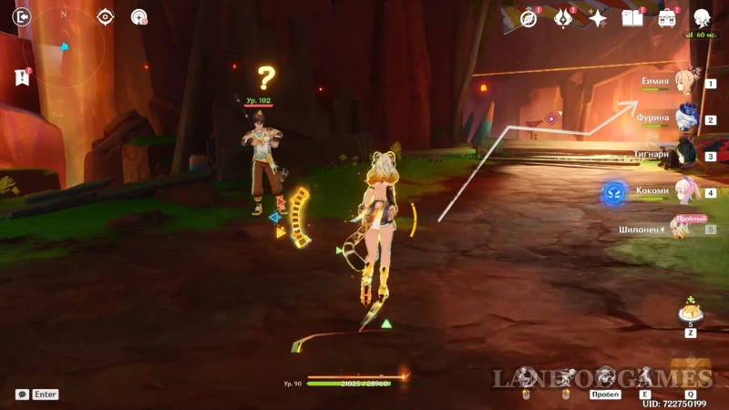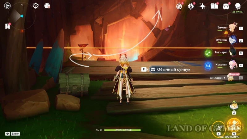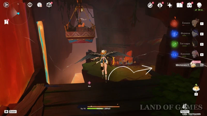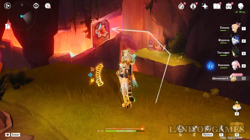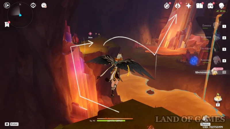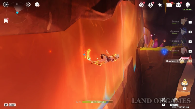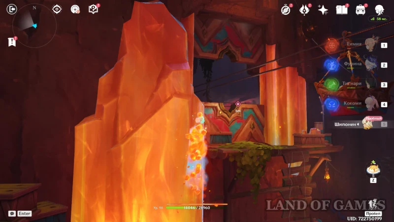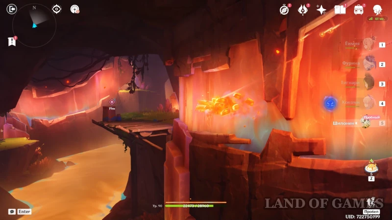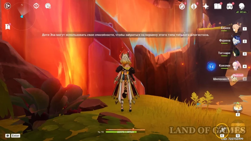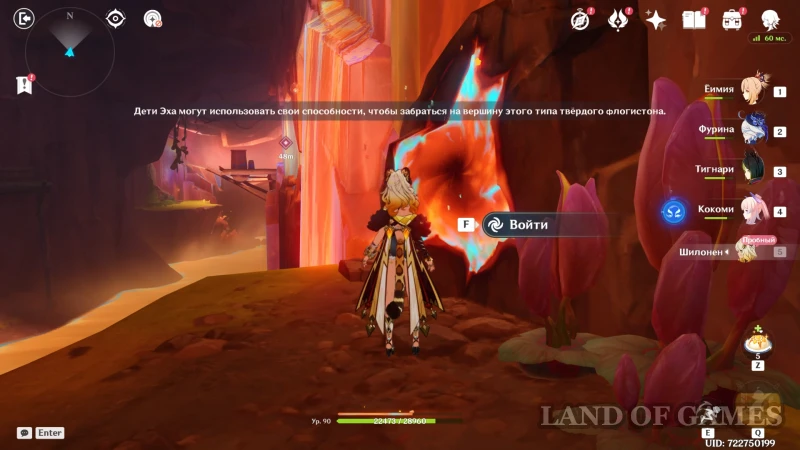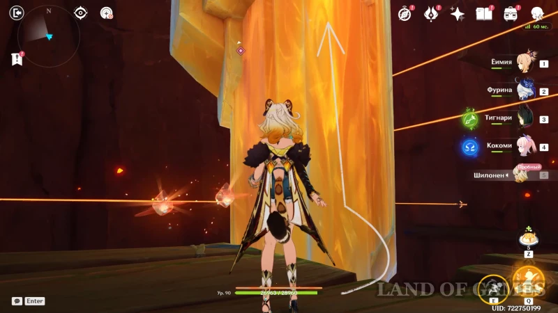 Доберитесь до участка со вторым настенным телепортом, подберитесь к нему на роликах Шилонен и войдите в породу флогистона — телепорт автоматически направит героиню к дальнему краю стены. Остается пролететь до участка с высоким вертикальным кристаллом, находящимся за потоком лавы. Используйте элементальный навык гео героини, чтобы подниматься по янтарным скалам и преодолевать вертикальные расстояния.