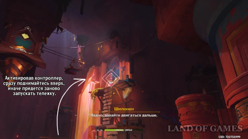 После активации контроллера и запуска тележек, сразу бегите к телепорту и используйте Шилонен, чтобы подняться вверх. Вас ждет мини-испытание, в котором нужно успевать переключать рычаги после того, как телега войдет на ближайшую станцию. Весь процесс прохождения мы записали на видео ниже: