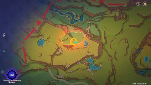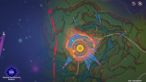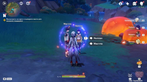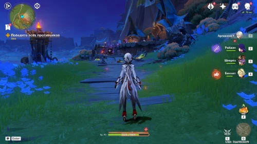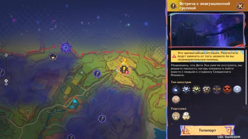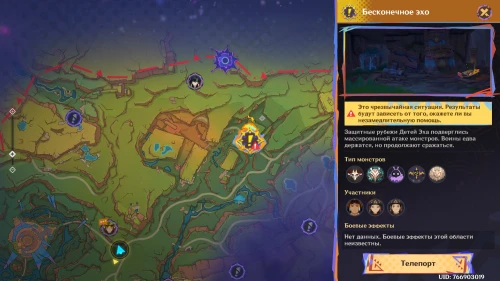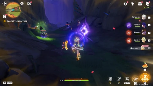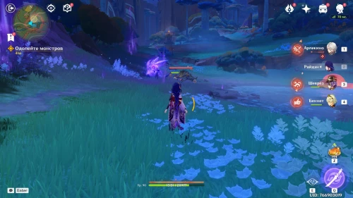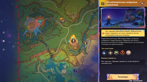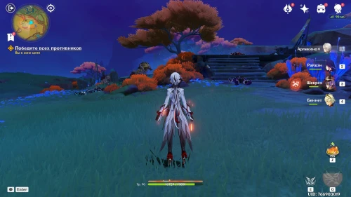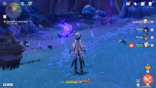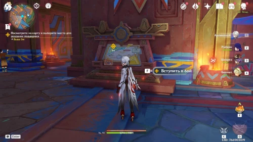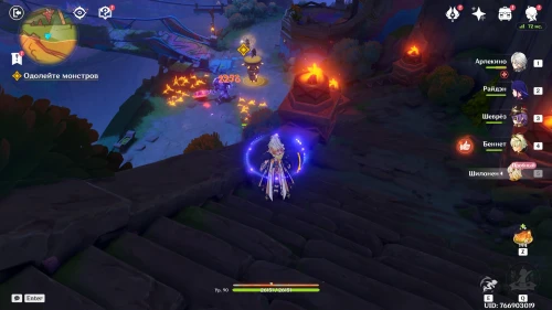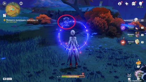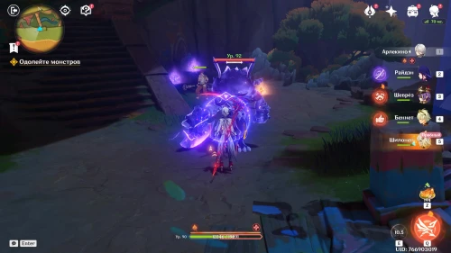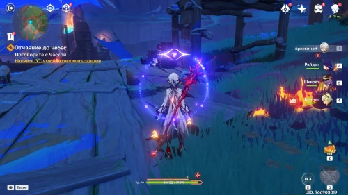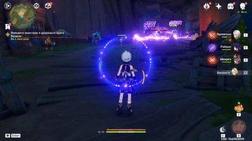 Нажмите на иконку и телепортируйтесь в новую область. Затем бегите на площадку и вступите в схватку с хиличурлами. Разобравшись с митачурлом и лучниками, вы столкнетесь с особым хиличурлом-изгоем. Дело в том, что у него будет присутствовать барьер, как у врат Бездны. Для его уничтожения вам необходимо будет использовать стихийные атаки.