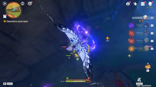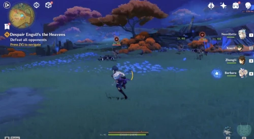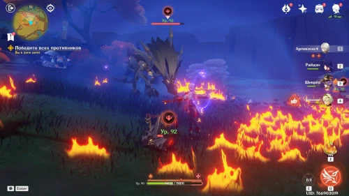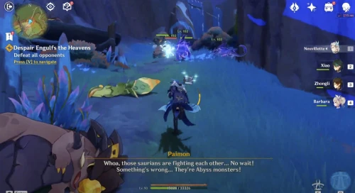 Переместившись в нужную область, бегите вперед. Вы увидите, как натлановцы сражаются с ордами монстров Бездны, среди которых будет Электро маг Бездны (так что не советуем брать Электро дамагеров). Сначала разберитесь с вратами, которые постоянно призывают новых врагов, а уже потом беритесь за устранение врагов.