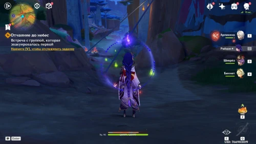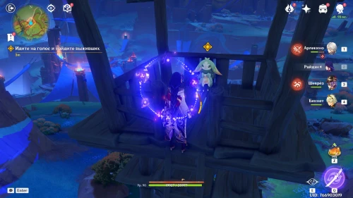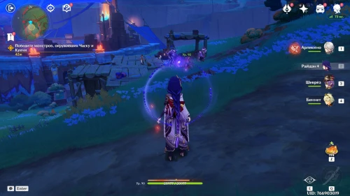 Поболтав с друзьями, направляйтесь в клан Цветочного Пера, однако по пути туда вы обнаружите Часку и раненную Куичи. Вступите в схватку с монстрами, которые окружили сестер. Сначала расправьтесь с хиличурлами, а потом уже беритесь за призрачного митачурла. Напомним, что для уничтожения его щита нужно использовать стихийные атаки.