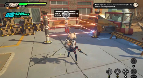После старта испытания бегите вперед и расправьтесь с первой группой бандитов, играя только за Бернис. Покончив с ними, подойдите к Пайпер, которая будет стоять за лазерной решеткой, и взаимодействуйте с рычагом, спрятанным за коробками слева. Освободив подругу, побеседуйте с ней.