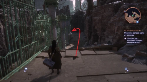 Добравшись до нее, бегите в проход слева, рядом с лестницей. Пройдите вдоль забора и сверните влево, где перешагнув через завесу, автоматически запустится новый побочный квест.