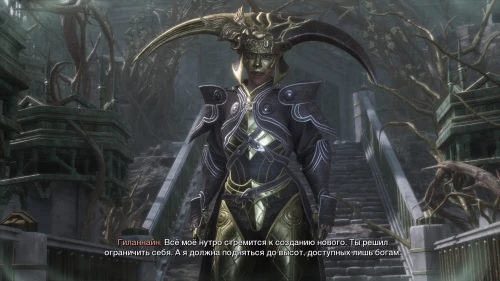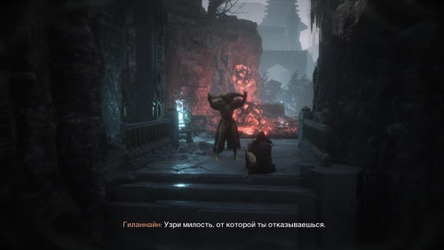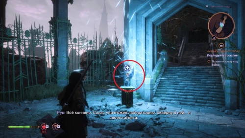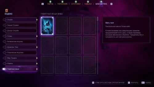 Перед тем, как следовать далее, сверните в проход слева и заберите памятную вещь «Мать галл» — театральная маска Гиланнайн, дающую +100 к силе смотрителя.