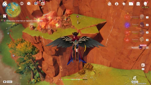 После общения с девушкой сразу же активируйте навык Часки, а затем используйте кнопку спринта (ПКМ) для перехода в ускоренный полет. Далее начните пролетать через кольца, чтобы восстанавливать у себя очки флогистона. Вам необходимо будет пролететь через 20 колец за отведенное время. На гифке ниже показано, как это сделать.