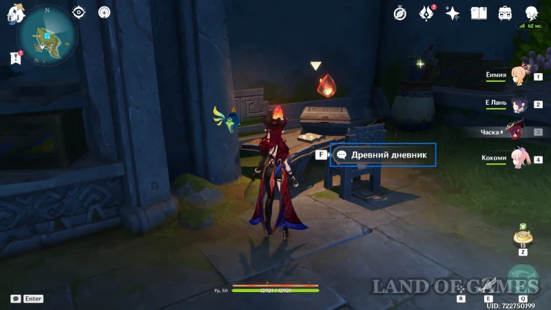 Зайдите в башню и спрыгните через отверстие в полу. Впервые посетив эту область, вы обнаружите драгоценный сундук и Сухой пурпурник (диковинка для прокачки Часки). Осмотрите стол в левой половине комнаты и прочитайте «Древний дневник».