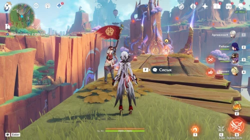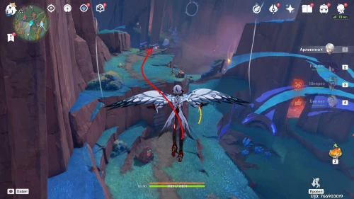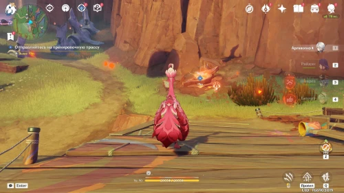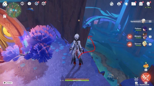 Разобравшись с указанными выше требованиями, направляйтесь в западную часть Пиро региона и активируйте статую Пиро Архонта к юго-востоку от поселения клана Повелителей Ночного Ветра. Затем начните идти на запад и спрыгните с обрыва вниз. Летите в сторону выступа с деревянной лесенкой и пройдите на площадку (смотрите скриншоты ниже).