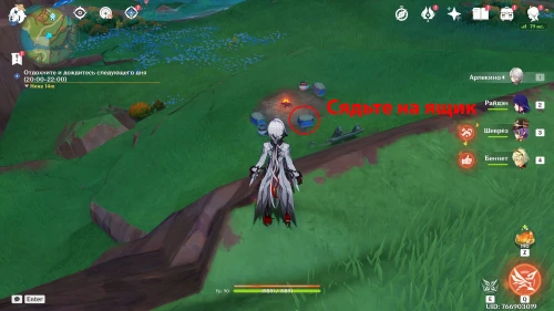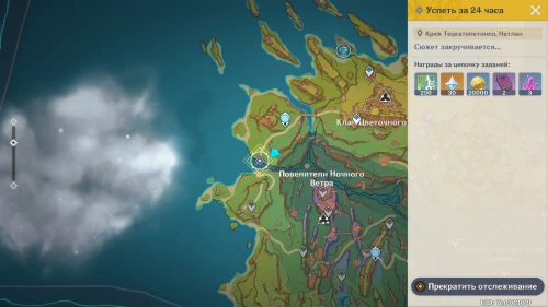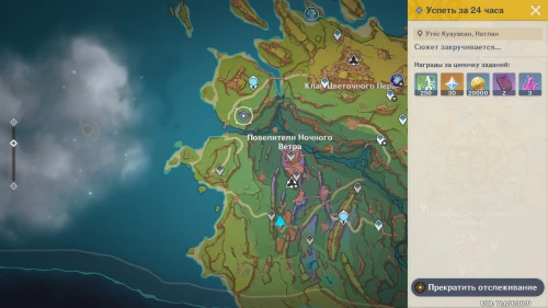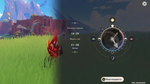 Итак, первым делом вам нужно будет изучить место, про которое вам рассказал Тарука. Телепортируйтесь к статуе Пиро Архонта к западу от клана Цветочного Пера, а затем бегите на юг к краю холма. После этого у вас тут же появится следующая задача – необходимо дождаться наступления следующего вечера. Прокрутите время с помощью меню Паймон на 20:00-24:00.