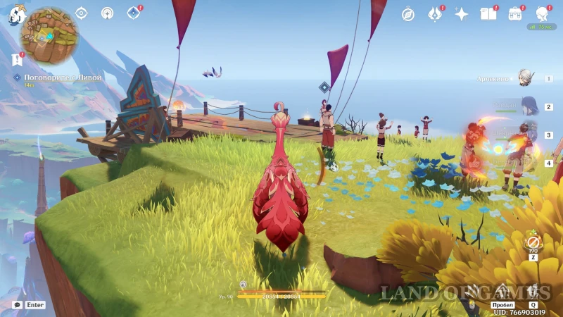 Первым делом отправляйтесь к месту начала гонок. Для этого превратитесь в кукузавра с помощью красного камня трансформации и воспользуйтесь газообразным флогистоном, чтобы подняться на вершину скалы. Здесь поболтайте с Ливой и согласитесь начать испытания.
