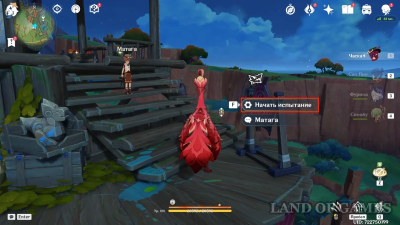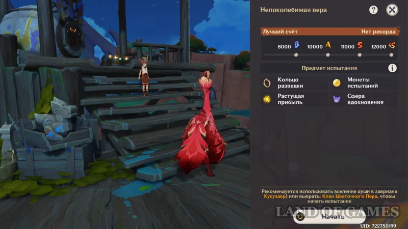 Подойдите к стенду, похожему на мишень, и кликните «Начать испытание». Далее вас ждет забег «Непоколебимая вера», по ходу которого нужно набрать как минимум B-ранг. Чтобы открыть все награды испытания, наберите более 11 тысяч очков (прохождение на SS нужно для получения общей ачивки «Духи битвы...» за все тренировки от Клана Цветочного Пера).