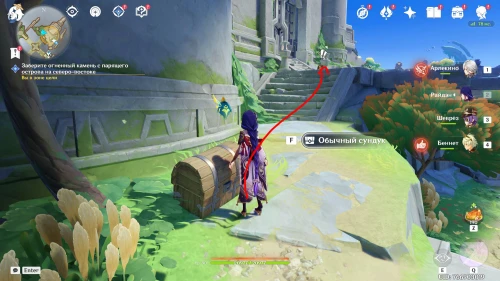 После завершения ролика вновь трансформируйтесь в кукузавра с помощью камня и летите на остров, расположенный впереди и справа. Приземлившись, пройдите направо, изучите «Оставленные записи II» при желании, а затем начните подниматься по лестнице вверх, открыв по пути богатый сундук. Снова войдите в башню, чтобы ваш завриан забрал огонек. На гифке ниже показан весь процесс.